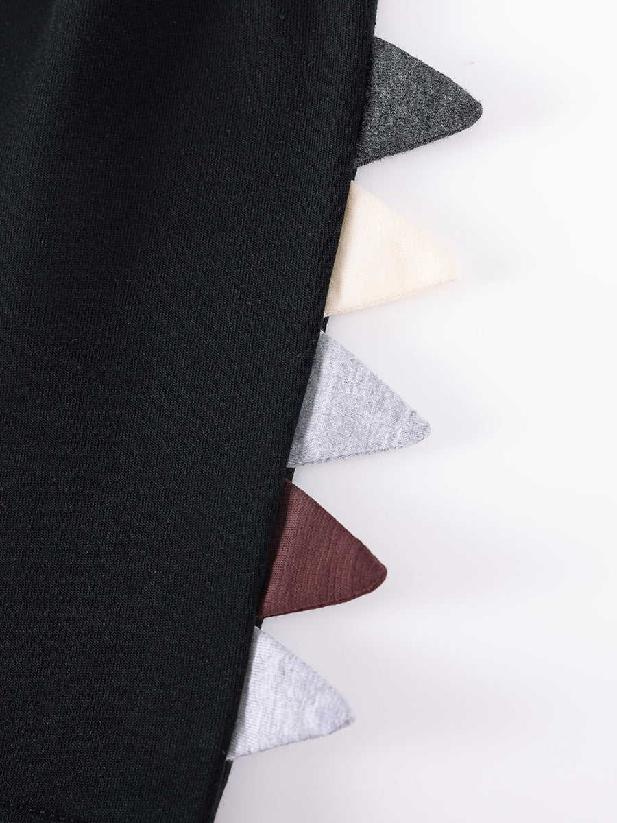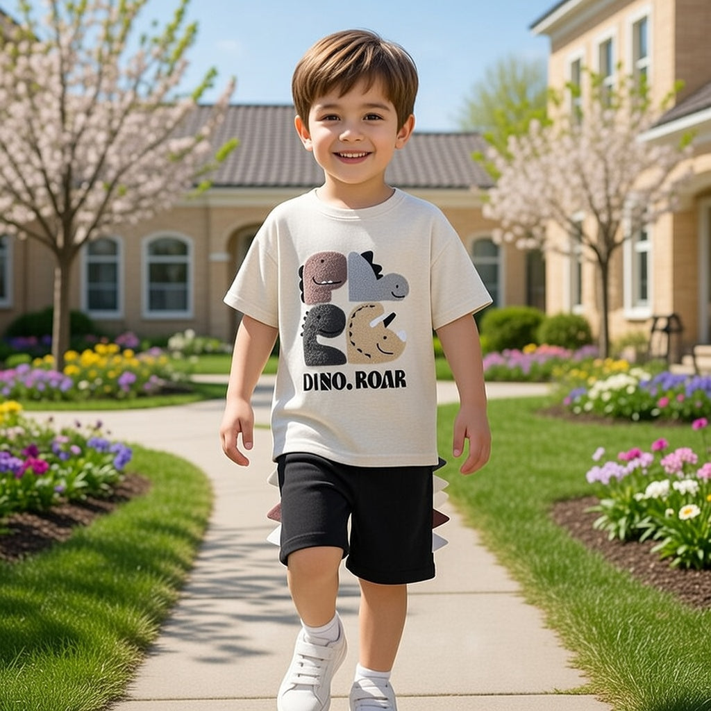 Crafted from what appears to be a soft, breathable fabric blend, the short-sleeve top offers a relaxed fit ideal for active play, while the matching shorts provide easy movement with an elastic waistband. The shorts include subtle spike details along the side, echoing the dinosaur theme for added charm.