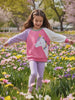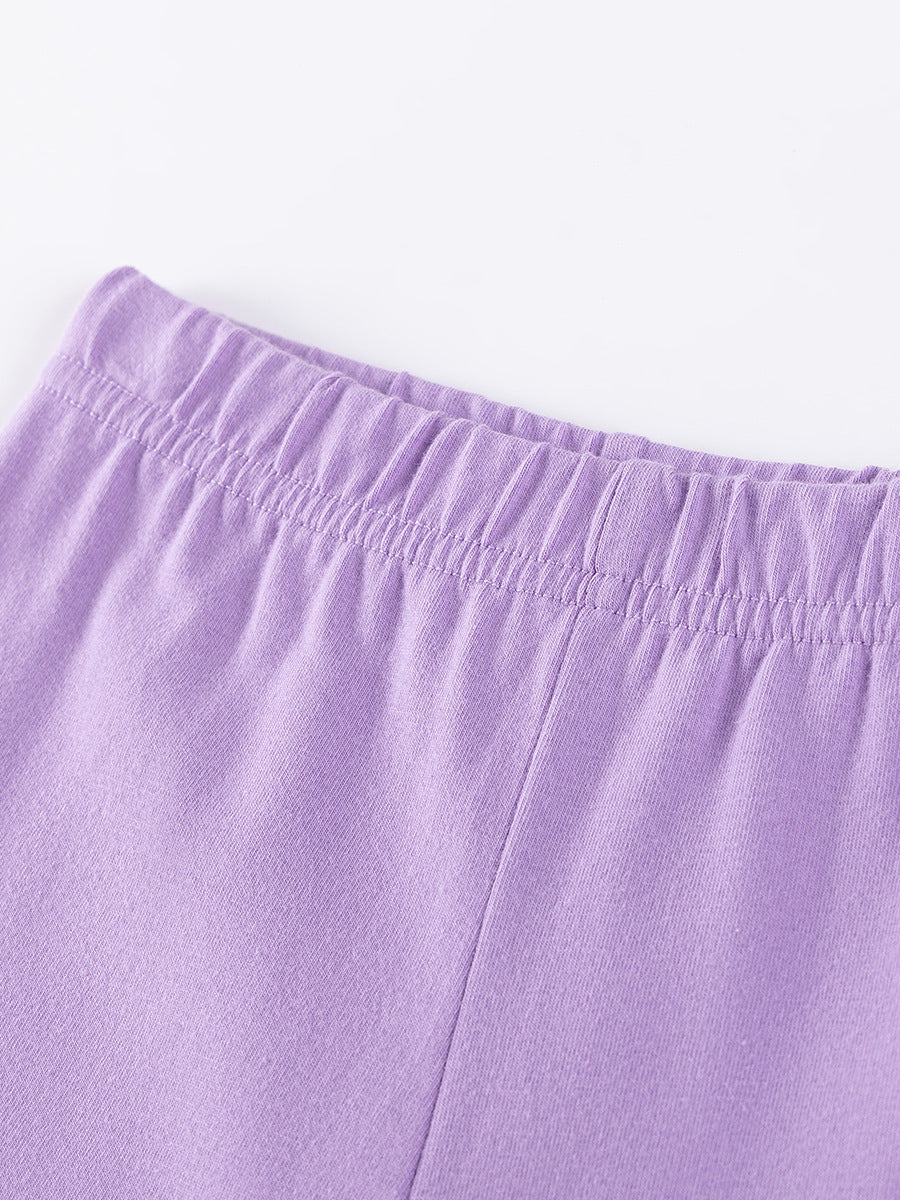 The contrasting white sleeves and green crew neckline bring fresh pops of color, while the soft, brushed fabric offers gentle warmth and comfort. Paired with smooth lavender leggings that feature an easy elastic waistband and a relaxed fit through the legs, this set moves beautifully with active play or quiet moments.