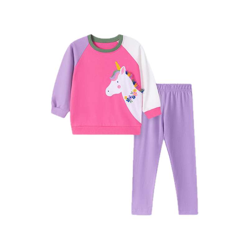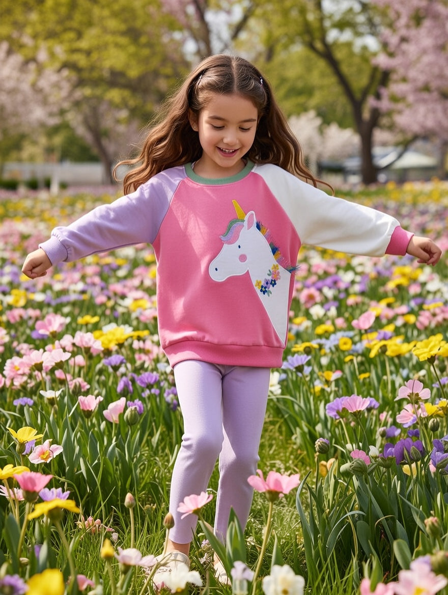 Caroagi creates joyful, imaginative outfits that make every day feel magical for little ones. This cozy long-sleeve set features a vibrant pink and lavender raglan sweatshirt with a charming embroidered unicorn centerpiece—complete with a golden horn, flowing multicolored mane, and delicate floral accents that add a touch of enchantment.
